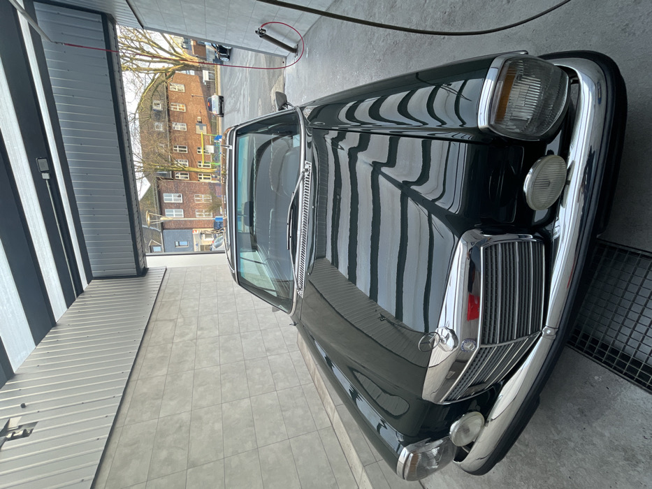 A dark green vintage Mercedes-Benz, likely a W111 or W108/109 series, is parked front-first within a covered wash bay in Oberhausen, Germany