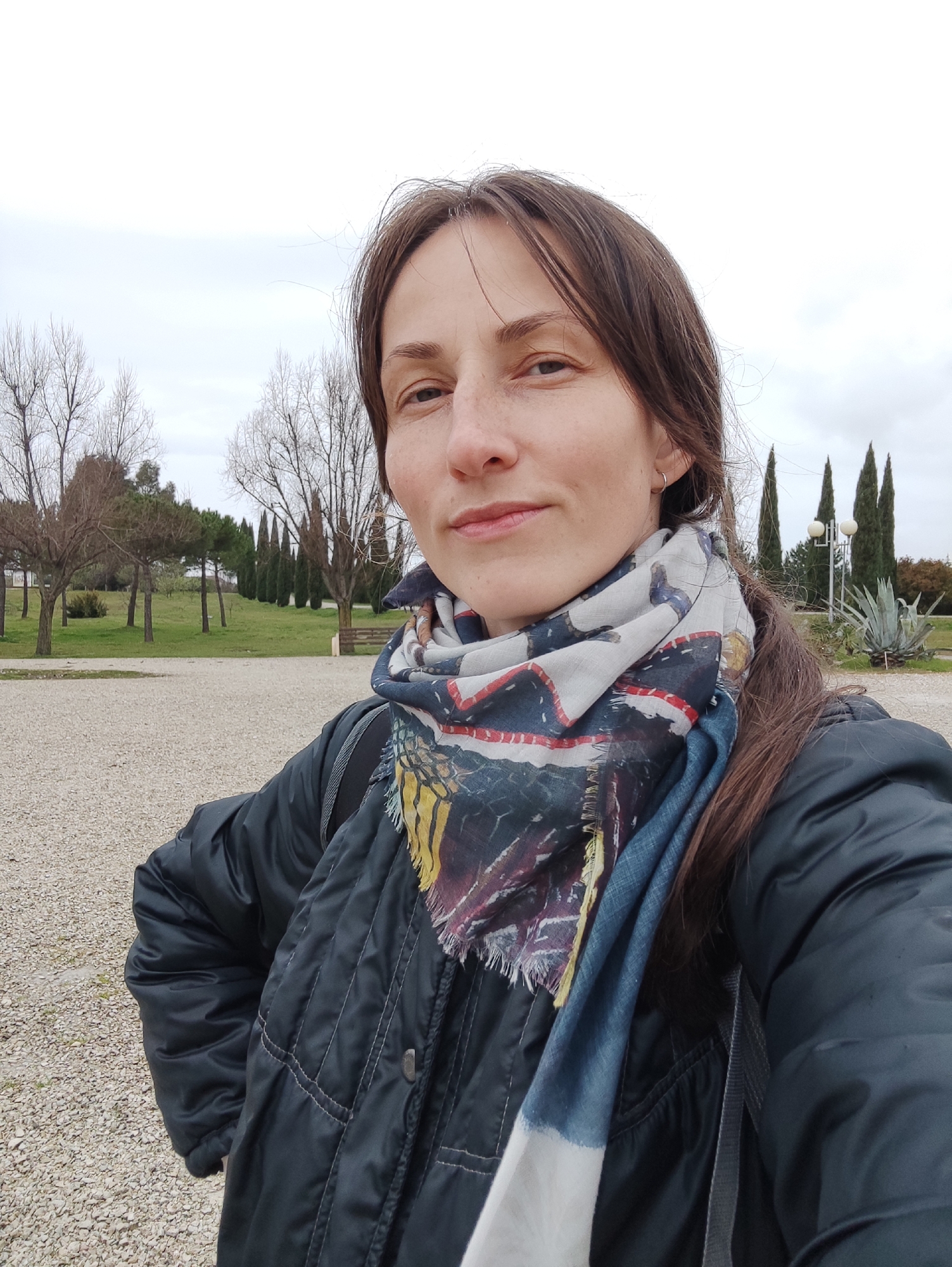 A medium shot captures a woman outdoors. She has fair skin, brown hair with some loose strands around her face, and is wearing a dark quilted jacket and a patterned scarf. The backdrop is a park-like setting with gravel ground, trees (some bare, others evergreen), and a row of tall, slender cypress trees in the distance. The sky is overcast. The location is indicated as Sirius, Russia.