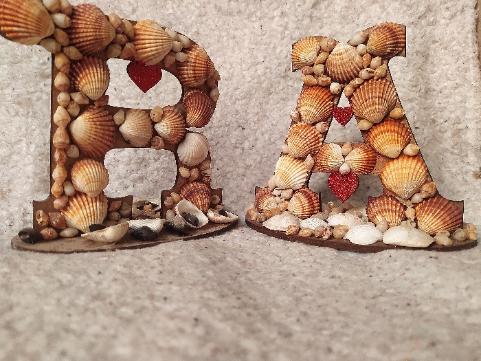 The image displays two decorative letter forms, 'R' and 'A', positioned upright on a light, granular surface. The scene is located in Harasta, Syria. Both letters are constructed from a solid base material, likely wood, and are extensively covered with various types of seashells, small pebbles, and glitter-covered heart embellishments. The letter 'R' features numerous ridged bivalve shells in shades of cream and light brown, interspersed with small, light-colored pebbles. A single red, glitter-covered heart is affixed within the upper enclosed loop of the 'R'. The base of the 'R' includes a collection of smaller shell fragments and dark pebbles. The letter 'A' is similarly adorned with bivalve shells and pebbles. Two red, glitter-covered heart embellishments are present within the structure of the 'A', one positioned centrally near the top intersection and another lower down. The letters rest on a textured, sandy-colored surface, consistent with fabric or fine sand. No human figures or active interactions are visible in the scene.