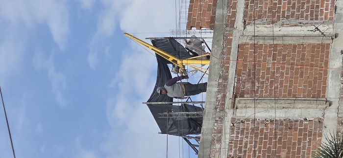 The image displays a construction site in Cholula de Rivadavia, Mexico, under a bright blue sky with scattered white clouds
