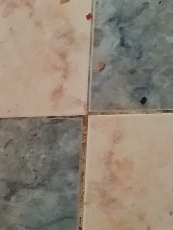 close-up view of a tiled floor in El Hajeb, Morocco. The floor is composed of four square tiles: two off-white tiles, one with a light brown marbled appearance and one with a darker marbled appearance, and one tile with a dark blue-green marbled appearance. The tiles are cracked at the seams. The floor appears to be in a worn and dirty condition, with red, brown, and black stains visible. There are no people or objects present in the image.