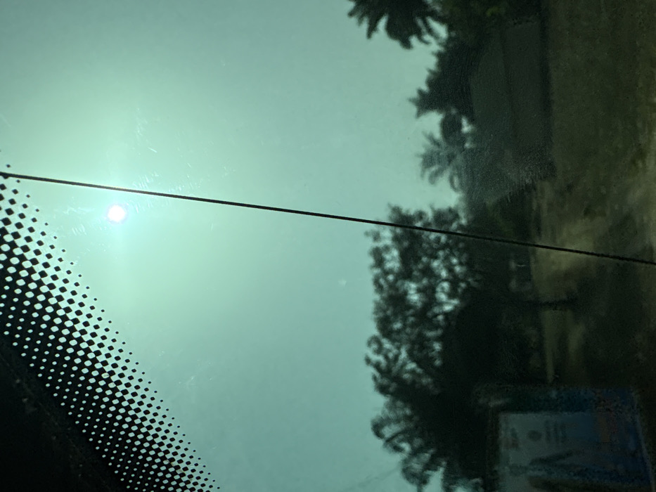 The image displays an outdoor scene in Gudi, Nigeria, viewed from inside a vehicle through a green-tinted windshield. A black frit band is visible along the top left edge of the windshield, and a thin, dark vertical line, consistent with an antenna wire, extends from the top to the bottom of the frame slightly right of center. A brilliant white sun glare is prominent in the upper right quadrant, reflecting off the glass. The sky, tinted green by the windshield, occupies the upper half of the image. The lower half features a landscape dominated by dark, silhouetted tropical vegetation, including numerous broadleaf trees and distinct palm trees. An unpaved dirt path or road is discernible in the lower center, curving towards the right. A dark, single-story structure is partially visible behind the vegetation in the mid-right. On the far left, a blurred rectangular object, likely a poster or billboard, shows faint blue and white elements, including what appears to be a human figure's torso. No individuals, specific actions, or interactions are present in the observable scene.