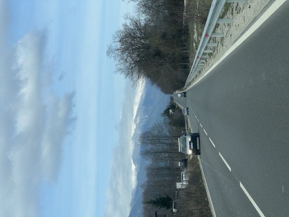 The image displays an asphalt road extending into the distance within the city of Dobrinishte, Bulgaria. The two-lane road features a broken white center line and solid white shoulder lines. On the right side of the road, a metal guardrail with red reflectors runs alongside a dirt and gravel shoulder, backed by bare deciduous trees and brush. On the left side of the road, additional bare deciduous trees, some evergreen conifers, and a partially visible structure are present. Several vehicles are observed on the road. In the lane nearest to the viewer, a silver-grey SUV, identified as a Subaru Forester based on visible features, travels towards the viewer with its headlights illuminated. A partially visible Bulgarian license plate on this vehicle reads "C 9984 KM." Further down the same lane, a dark sedan and a white box truck are also proceeding towards the viewer. In the opposing lane on the left, a dark sedan is observed moving away from the viewer. In the background, a range of snow-capped mountains is visible under a sky characterized by a mix of blue and scattered white and grey clouds. The overall environment, with bare trees and snow on the mountains, indicates a late autumn or winter season. No individuals are explicitly visible in the scene.