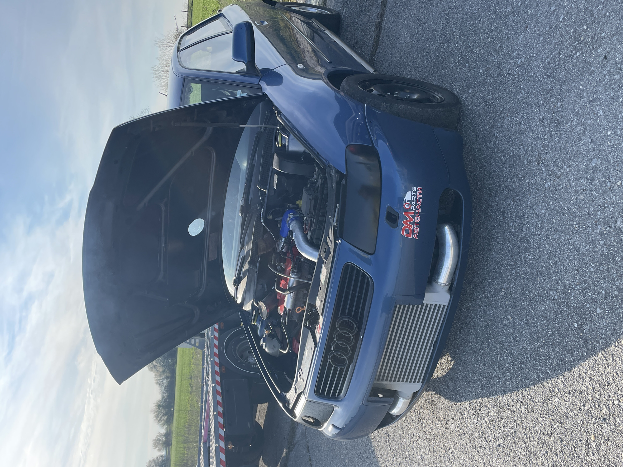 A blue car with an open hood is parked on an asphalt surface. The car has a front grill with the Audi logo and an intercooler installed at the front. A sticker with the words "DM Parts" in Russian and the word "auto parts" is visible on the front. The engine bay is visible with various hoses, pipes, and engine components. In the background, a green field stretches towards the horizon under a partly cloudy sky. A vehicle transport trailer with a red and white striped barrier is partially visible to the left of the car. The photograph was taken outdoors in the daytime. The city of Ostrovo, Bulgaria is not discernible from the provided visual information.