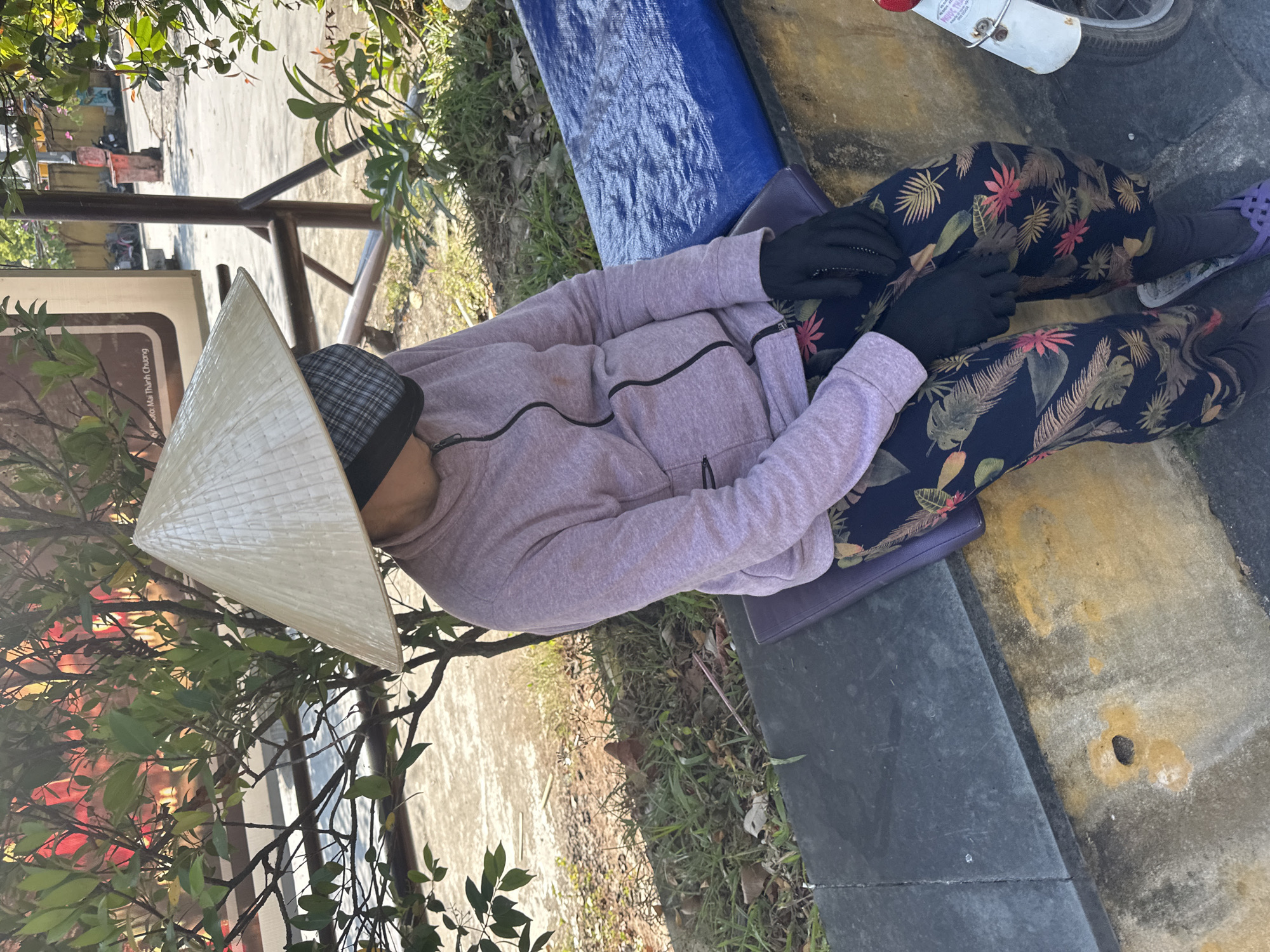 A person wearing a traditional Vietnamese conical hat, a black plaid baseball cap, a lavender zip-up sweatshirt, black gloves, and patterned dark blue leggings with floral and leaf designs, sits on a purple cushion near a concrete curb. They appear to be resting or sleeping. Adjacent to the curb is a strip of grass and foliage, with a metal railing and part of a sign visible nearby. A section of blue material is seen next to the person, and the wheel of a motorbike is visible in the top right corner. The scene is located in Hội An Ward, Vietnam. The ground is a mix of concrete and dirt with sparse vegetation.