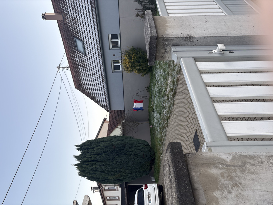 The image depicts a residential scene in Ostwald, France, under a clear, light blue sky. In the foreground, a concrete gate pillar is on the left, partially obscuring a light grey metal gate with white vertical slats that extends to the right. The gate is closed, and a white handle and keyhole are visible on the right gate section. Immediately behind the gate, a patterned paved driveway is visible on the left, leading to a white SUV (Citroën, license plate GC-196-AT) parked facing away from the viewer. A dark square drain cover is embedded in the driveway. To the right of the driveway is a lawn covered with a sparse layer of frost. A large, dark green, conical coniferous tree stands prominently between the driveway and the adjacent property. Further into the yard, a small, pink spherical object (possibly a ball) rests on the frosted grass. Towards the rear right of the yard, a French flag (blue, white, red vertical stripes, from left to right) is suspended on a line or short pole. A small, bare deciduous tree is located behind the flag, and a dense green bush is situated further right, against a building wall. In the background, a two-story house with a grey facade and a brown tiled roof, partially covered in frost or light snow, dominates the right side. It features a visible chimney on the roof, a skylight, and two white-framed windows on the lower story. A grey wall extends from this house, forming the rear boundary of the yard. Portions of another beige-colored house with a brown tiled roof are visible on the far left. Multiple utility power lines traverse the sky, connecting to a visible utility pole structure above the grey house. No individuals are visible in the scene.