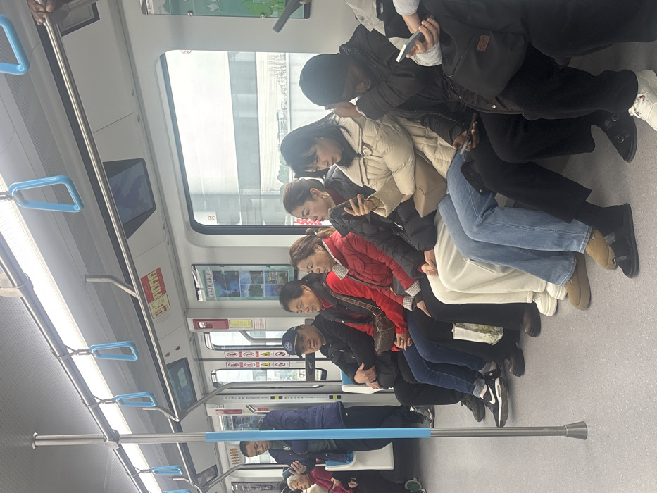 - "Inside a subway car, a row of seated passengers faces the same direction, likely engrossed in their phones" by FM-hd42B3, licensed under CC BY 4.0