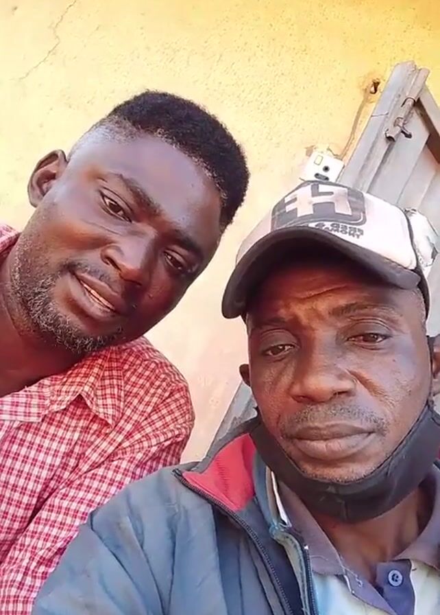 Two men are in the video. One man is wearing a red and white plaid shirt with a beard and close-cropped hair. The second man is wearing a baseball cap, a face mask, and a blue jacket. They are standing close together and looking at the camera. The second man begins to smile. The background is a beige wall and a wooden door or gate.