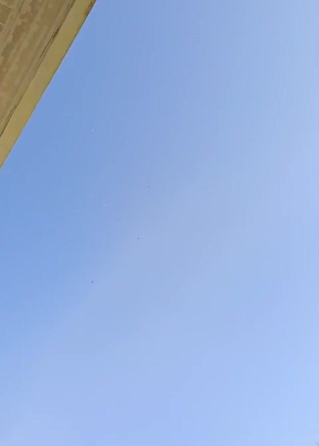 The camera is angled upwards, showing a bright blue sky. In the lower right corner, treetops are visible. A piece of a roof or overhanging structure is visible in the upper left corner. Several small, dark objects are scattered across the sky, appearing to be in flight. The scene is static with no visible camera movement.