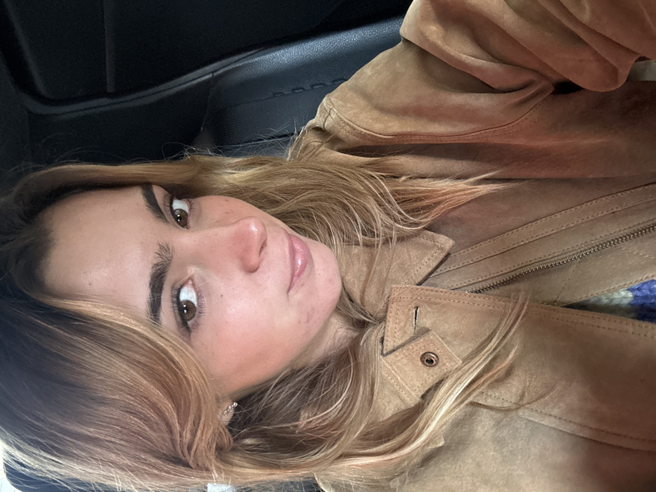 A close-up, chest-up portrait features a young adult female with light skin, light brown to blonde hair, and brown eyes, directly engaging the viewer with a neutral expression. She has thick, dark eyebrows and a small, possibly three-stone, silver-colored stud earring in her left earlobe. Minor skin blemishes are visible on her left cheek. She is dressed in a light brown or tan suede-like jacket, featuring a collar, a bronze-colored snap button on the lapel, and a metal zipper closure. A blue and purple patterned garment is partially visible underneath the jacket. The background on the right consists of a dark vehicle interior seat with visible stitching, while the left background is a blurred, lighter area suggestive of an exterior window. The individual is situated in a seated position, likely within a vehicle. This scene takes place in Villeurbanne, France.