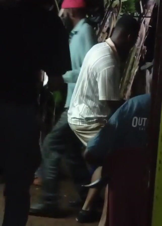 several people gathered in an outdoor setting at night. Some are standing, while one is seated on a red plastic chair. The person on the chair is wearing a blue denim jacket with the word "OUTDOOR" on the back. One person, in a white shirt and light-colored shorts, is dancing with a smile on their face. Another person in a black t-shirt and dark pants is standing close by and appears to be watching the dancing. A red baseball cap is visible on another person in the background. The area around them appears to be partially lit, with some foliage visible in the background. Music is playing in the background.
