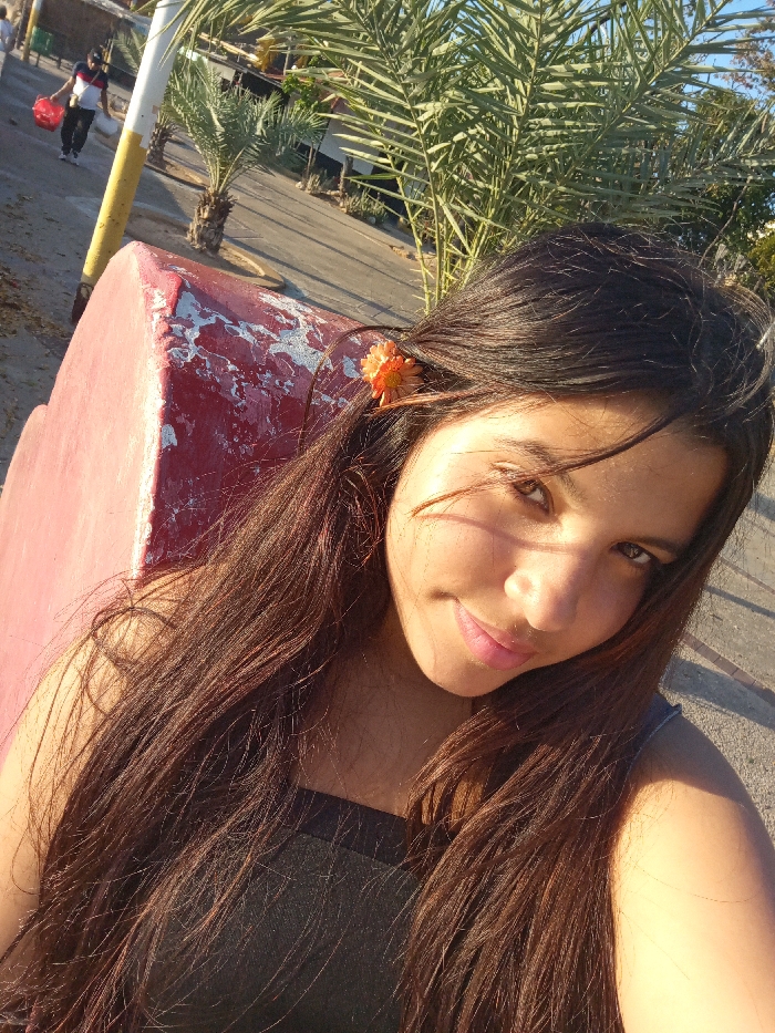 The image displays a young woman taking a selfie in an outdoor urban setting in Juan Griego, Venezuela. The woman, positioned in the foreground, has long dark brown hair and an orange flower above her right ear. She wears a dark strapless top and looks directly at the camera with a slight smile. To her left, a weathered red concrete structure with peeling paint is visible. In the background, a paved street or walkway is present, along which an individual walks away from the camera, carrying two red bags. Several palm trees and other green vegetation line the paved area, and faint architectural structures are visible in the distance. The scene is illuminated by natural daylight, casting some shadows.