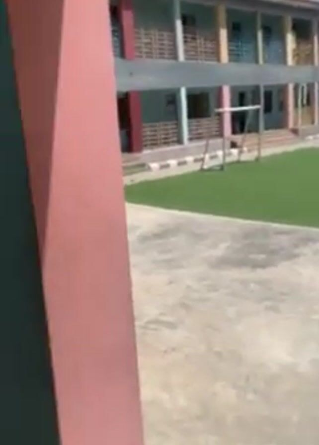child, possibly a student, walking on a corridor in a school building. The child is wearing a gray outfit and a hijab. The school building is painted in pastel colors, including blue, pink, and red. There is a yellow railing along the corridor. The corridor overlooks a green lawn and other school buildings in the background. The child walks towards the camera. The lighting suggests it is daytime and sunny.
