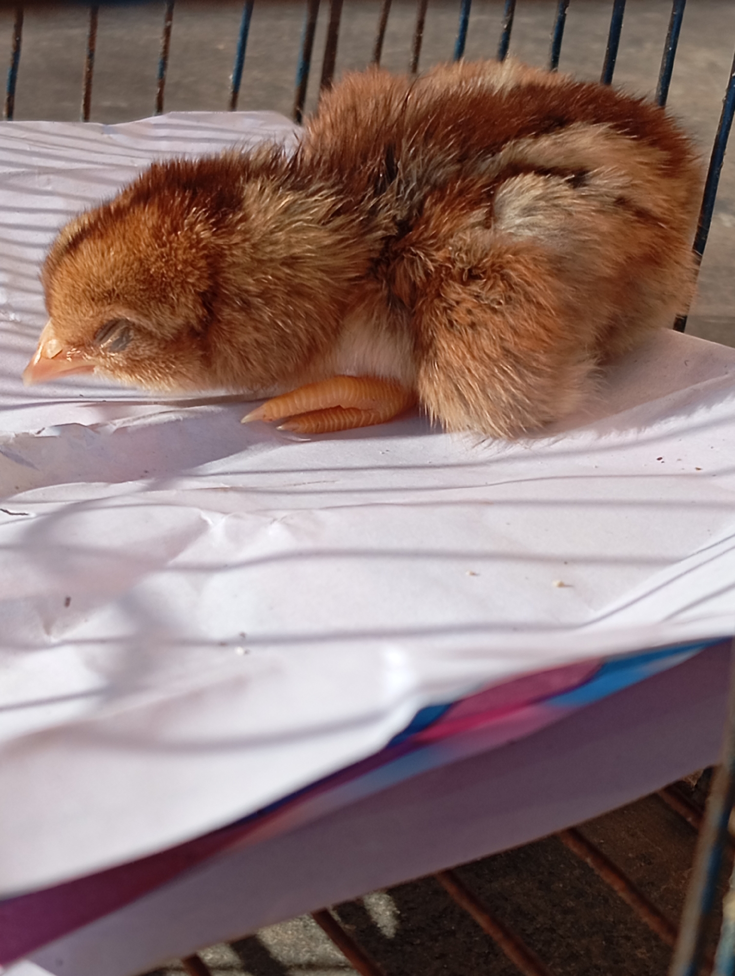 - "A small, brown, fluffy chick rests on a piece of white paper inside a cage" by FM-aOgcn1, licensed under CC BY 4.0