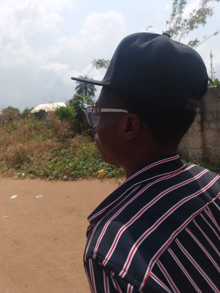 A person wears a black cap, eyeglasses, and a striped shirt. They are facing left, with a profile view. The background shows a dirt road, vegetation, a building, and a gray concrete wall. The sky is partly cloudy. The person's shirt has black and white stripes with red accents.