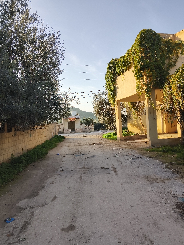 A rural road stretches into the distance. Overgrown vegetation clings to a building on the right, while a stone wall borders the left, partially obscured by trees. In the distance, a building with a sign stands near the road's end, set against a backdrop of rolling hills under a bright sky. The road itself is weathered, with visible cracks and imperfections. Power lines stretch across the sky.