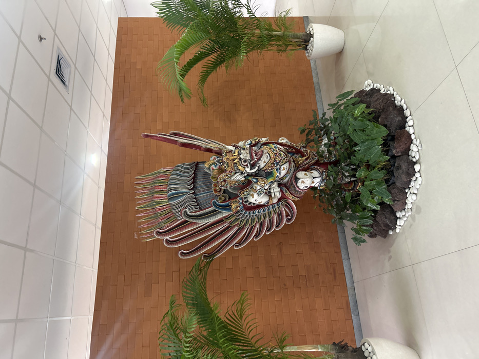 An ornate, colorful, and multi-headed mythical creature adorns a brown brick wall. Flanking the creature are two potted palm trees. One pot is positioned above the creature, while the other is below. Adjacent to the creature, a large potted plant with black lava rocks surrounded by small white pebbles is on the right side of the wall. The floor is tiled in a neutral color, and an air vent can be seen on the left wall.
