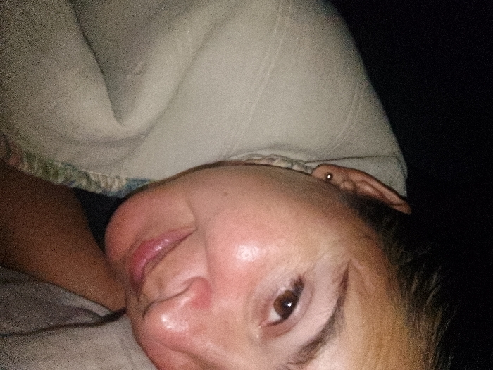A close-up shot features a person's face resting on a surface. Their right ear, adorned with an earring, is visible near the top edge. A light-colored fabric drapes above the head and shoulder. The background transitions into darkness. The individual appears to be lying down, with their nose, lips, and one visible eye dominating the foreground. Skin texture and facial features are clearly defined.