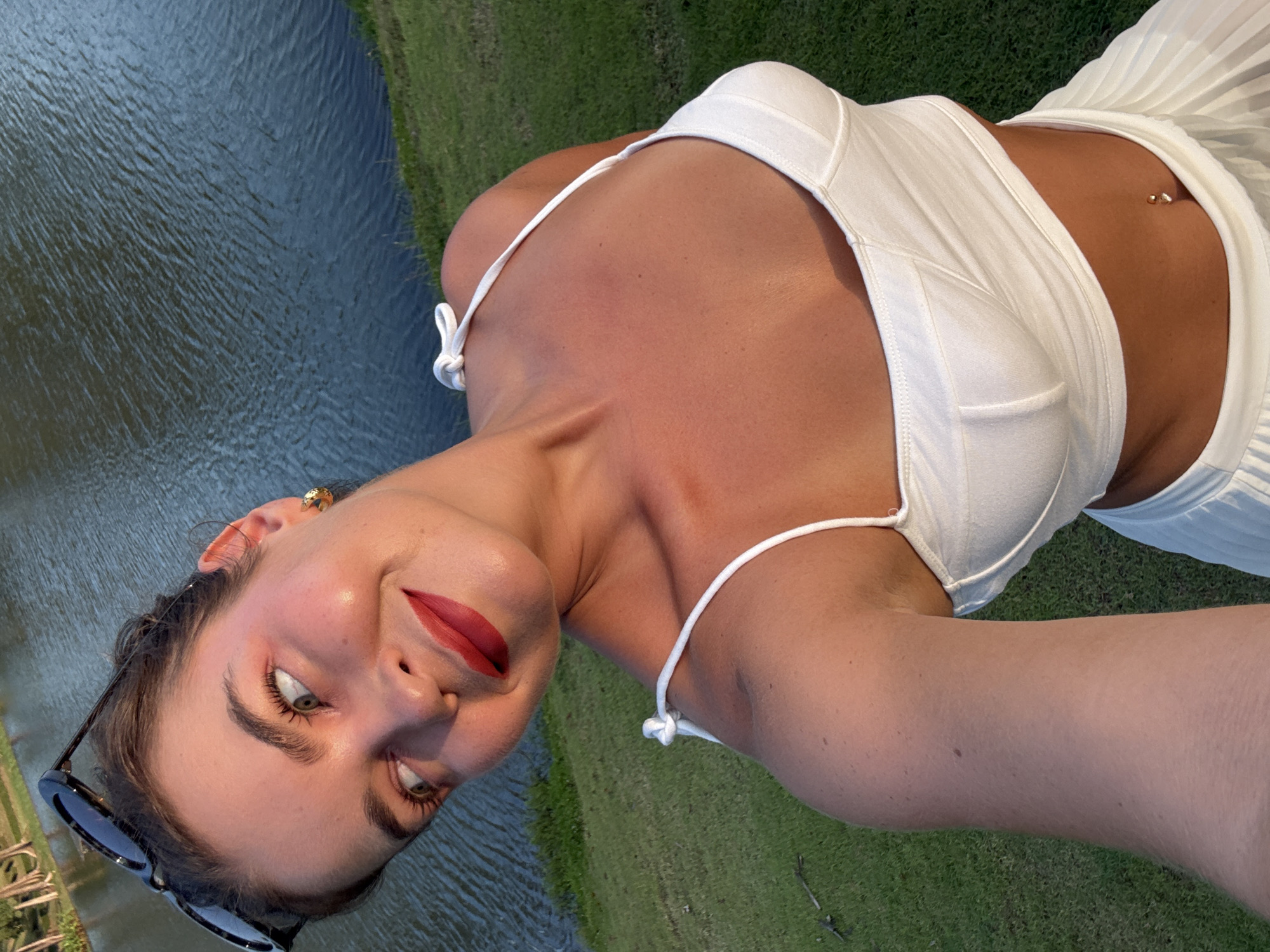 The image, taken in Choeng Thale, Thailand, depicts a female subject captured in a selfie-style photograph. The subject, appearing to be a young adult, has brown hair, fair skin with a warm, sunlit tone, and wears dark sunglasses atop her head. Her face features green eyes, defined eyebrows, extended eyelashes, and red lipstick. She is dressed in a white, tied-strap crop top and a white pleated skirt, revealing a navel piercing with gold-colored jewelry. Her head is tilted to the viewer's left, and her gaze is directed away from the camera towards her right. The background features a manicured green lawn in the lower left portion, transitioning to a body of water with discernible ripples on the surface in the upper right. Distant trees are partially visible across the water. The scene is illuminated by warm, directional light, consistent with golden hour conditions.