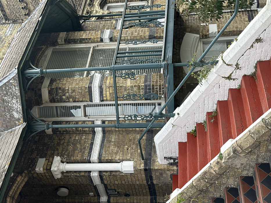 The image depicts the exterior of a multi-story building located in the city of Thanet, United Kingdom, characterized by its historical architectural features. The structure is primarily constructed from multi-toned yellow and brown brickwork, interspersed with horizontal dark blue or black brick bands and white decorative friezes. A white classical column with a Corinthian capital is affixed to the left side of the brick facade. A prominent feature is a projecting bay window structure with a dark green, ornate cast-iron balcony railing supported by matching pillars. The balcony floor appears weathered. Several windows are visible behind the railing, fitted with internal horizontal blinds. A pane in the upper left window of the bay is notably broken or missing. The roof, partially visible at the top, is tiled and shows signs of moss or lichen growth. A circular white object, possibly a vent, is mounted on the upper left brick wall. In the foreground, a set of outdoor stairs ascends towards the left. The stair treads are painted a vivid red. The stair risers and side walls are constructed of white-painted brick, exhibiting cracks and sporadic growth of small green weeds. A dark green metal handrail, matching the balcony railing, runs along the right side of the red stairs. To the far left and lower, another section of stairs is visible, featuring darker, patterned tiles in a black and red diamond design, bordered by stone coping. No individuals are present in the scene.