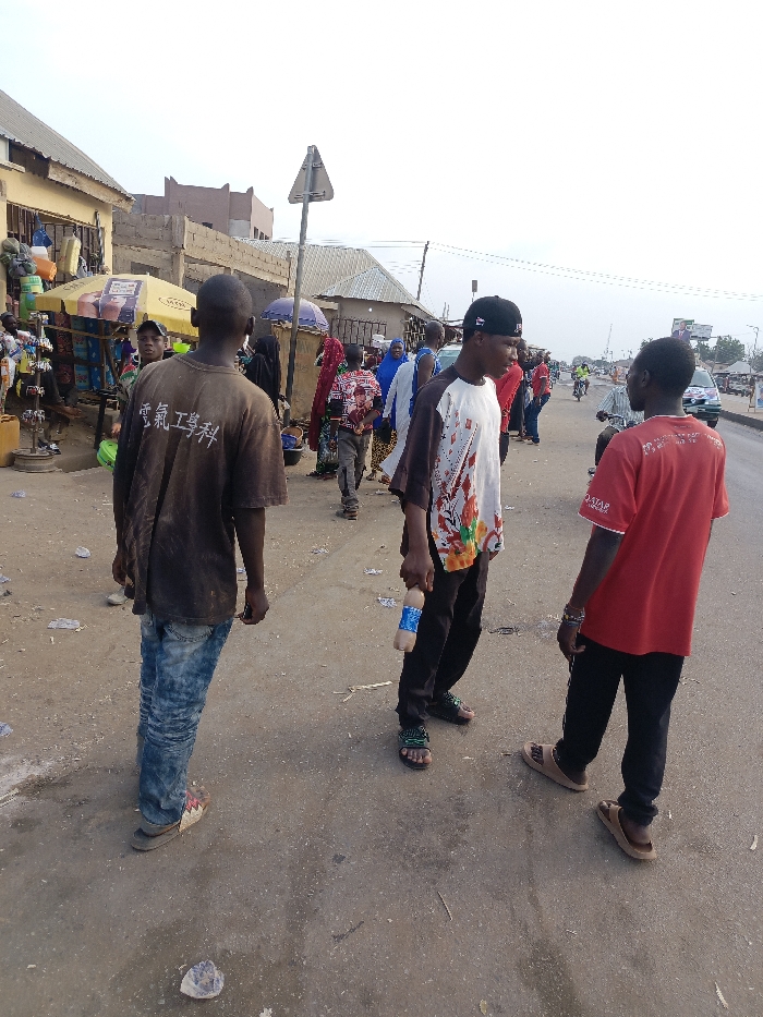 A street scene depicts three young men in casual attire. One wears a brown t-shirt with Japanese text, blue jeans, and sandals, his back to the viewer. Another, facing forward, sports a white shirt with floral designs, black pants, a cap, and sandals, holding a bottle. The third, with his back partially turned, dons a red t-shirt, black pants, and light brown sandals. A bustling market is visible in the background with various people, buildings, and street vendors. A road stretches into the distance with a car and a motorbike.