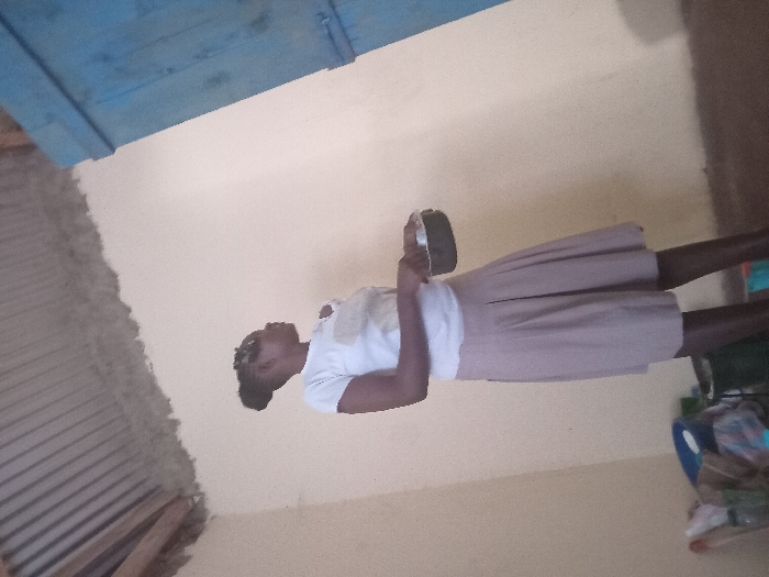 A young woman stands indoors, holding a circular object. She wears a white t-shirt and a light brown skirt. The background features a tan wall, a blue wooden structure on the ceiling, and corrugated metal sheeting to the left. A cluttered area with various items is visible to the lower right. The image is rotated to the side.