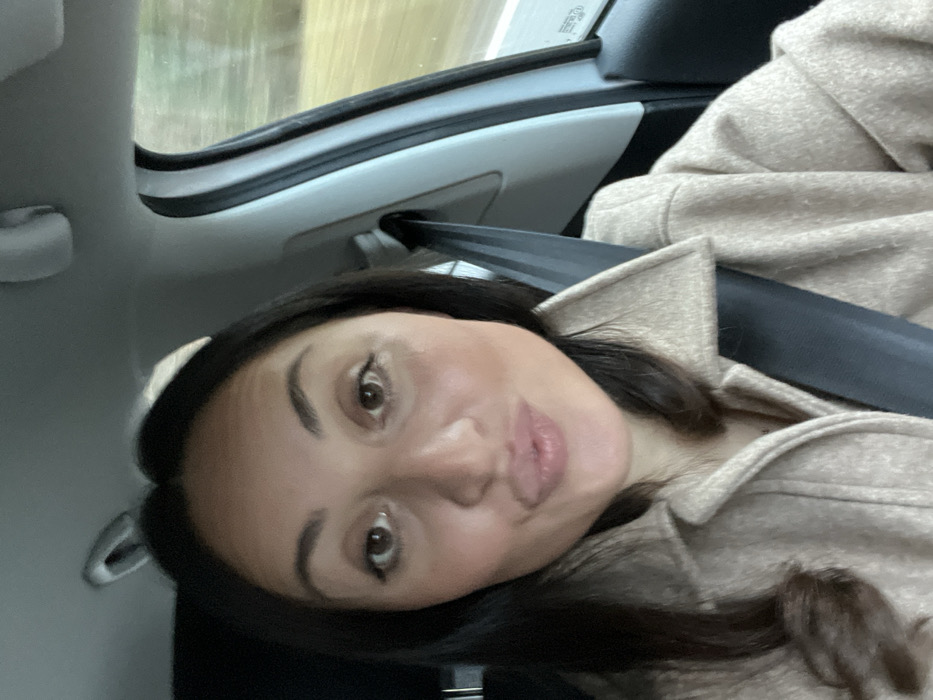 A woman with brown hair and eyes is positioned in the driver's seat of a car, wearing a light brown coat and a seatbelt. She is looking at the camera with slightly pursed lips. The car's interior is visible, including the window frame and some blurred scenery outside, suggesting the car is in motion. The image is taken at an angle, with the woman's face slightly tilted.