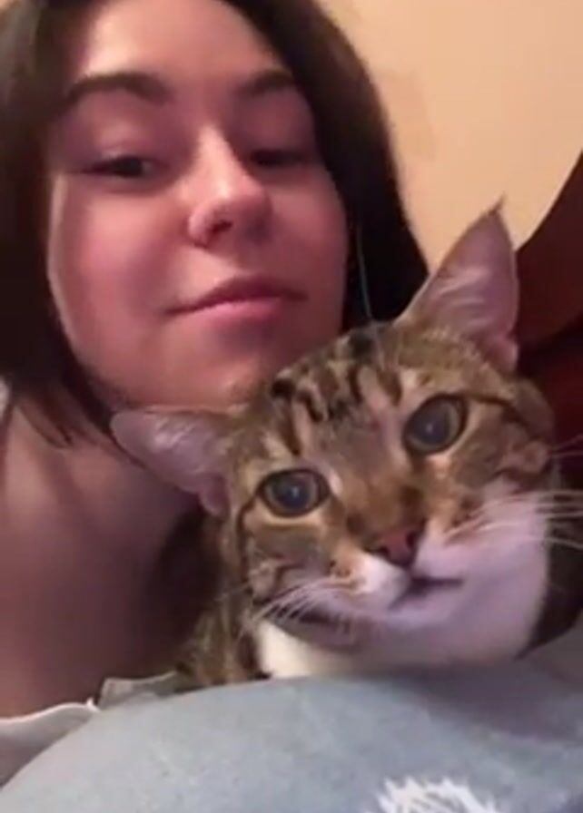 A young woman is holding a brown tabby cat in her lap. The woman has dark hair and is wearing a white tank top. The cat has green eyes and a white patch on its chest. The woman looks at the camera and briefly puts her finger in her mouth. The background is a blurred room with a wooden headboard visible behind the woman.
