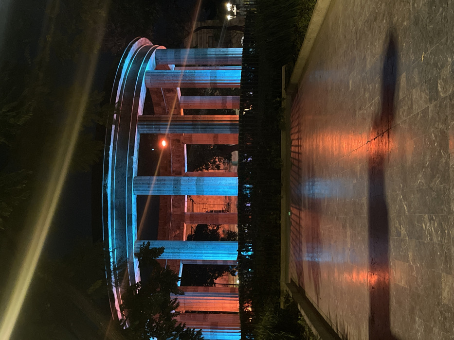 A circular colonnade structure is illuminated in blue and orange light, casting shadows on a paved walkway to its right. Trees and darkness surround the structure. The walkway appears wet, reflecting the colors of the colonnade. The perspective is from a low angle, and the image is oriented sideways.