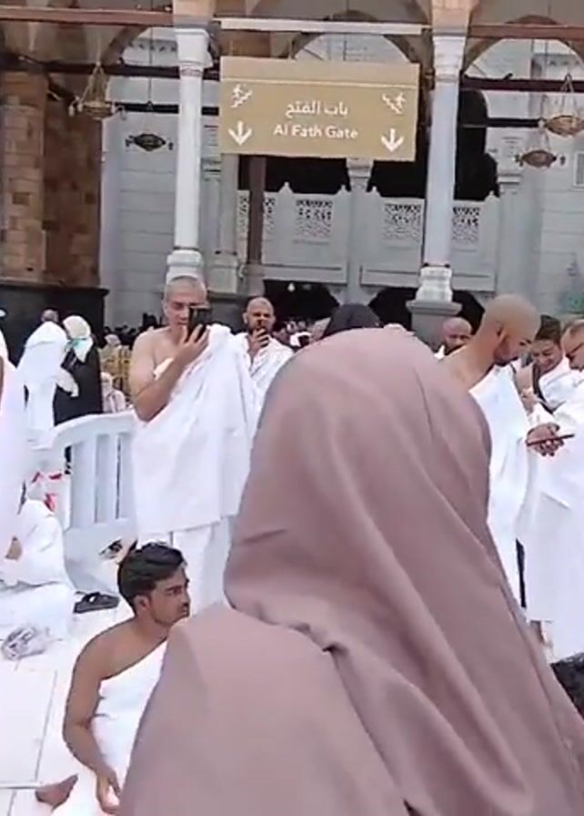The video depicts a large gathering of people, primarily men, dressed in white robes, some taking photos with their phones. The scene is in an outdoor space with arches and columns, identified by a sign as "Al Fath Gate". A woman in a brown hijab stands in the foreground, while others in the crowd are seated or milling about.