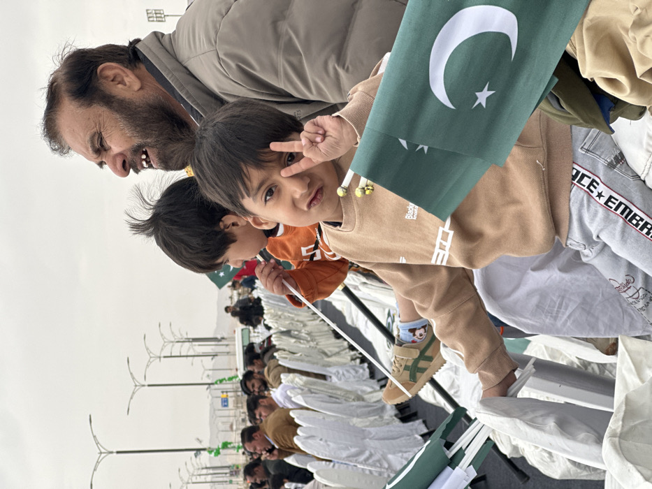 A man and two children smile while holding Pakistani flags. The child closest to the camera flashes a peace sign. The background shows rows of chairs covered with white cloths, suggesting a formal event. Many people are seated in the chairs. The sky appears overcast. The child's clothing includes a brown sweater, grey pants with text, and tan sneakers with socks featuring a cartoon character.