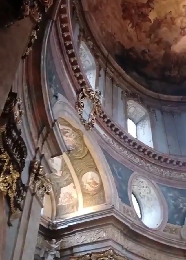 The camera slowly pans up, revealing the interior of an elaborate dome. The dome is adorned with frescoes of figures in a cloudy sky. Ornate architectural details line the dome’s base, including decorative arches, moldings, and what appears to be a crest. Windows are evenly spaced around the dome’s base, providing light. The scene appears to be within a historic building.