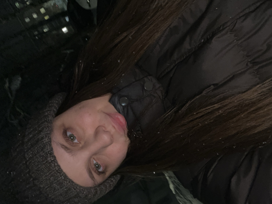 A female, identified as a young adult, is depicted outdoors at night in the city of Chaikovsky, Russia. She is shown from the upper chest upwards, wearing a dark grey knitted beanie and a dark, possibly black, puffer jacket with large snap buttons visible on the collar area. Her long, dark brown hair is visible beneath the beanie, extending over her shoulders and jacket. Small white particles consistent with falling snow or sleet are distributed across her hair and jacket. Her eyes are green/hazel, and her lips are slightly parted, forming a soft, somewhat pouting expression. The background is dark, with illuminated windows of several multi-story buildings discernible in the distance, indicating an urban environment. The woman is looking directly at the camera, with her head slightly tilted to the right and her left shoulder subtly elevated.