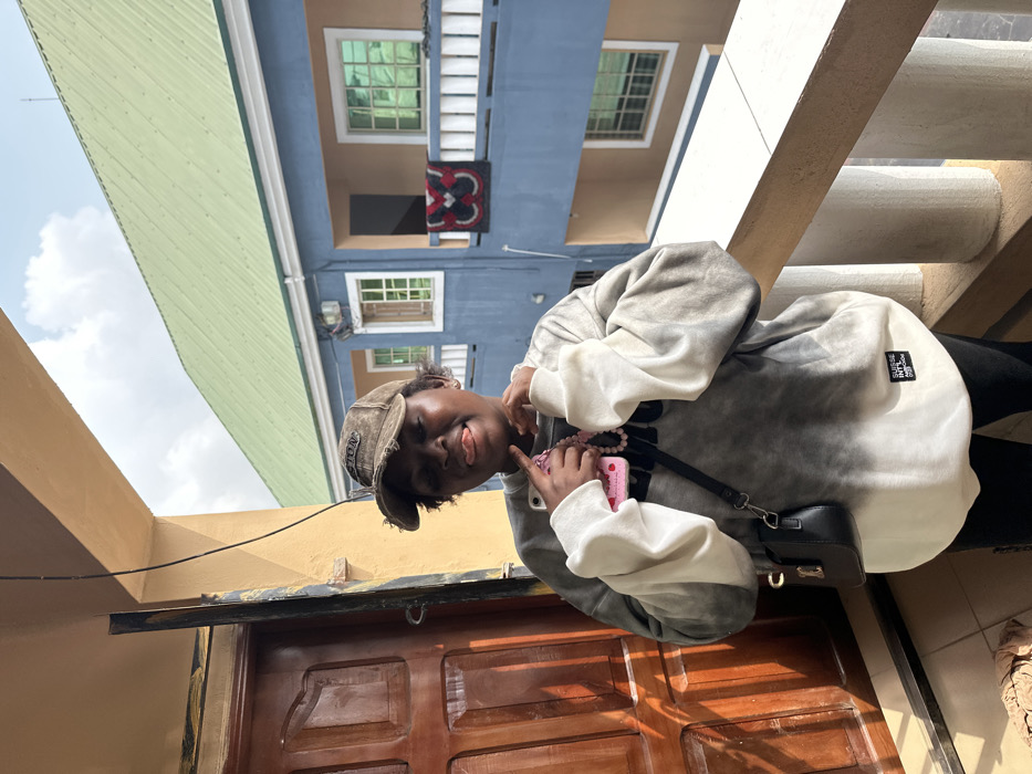 An outdoor, daytime image captures a female subject on a residential balcony in Oyigbo, Nigeria, with another building in the background. The subject, an adult female with short, dark, curly hair, stands centrally, facing the camera. She wears a distressed brown baseball cap with "BOSTON" on the front, an oversized tie-dye sweatshirt fading from dark grey to white, and dark pants. A small black cross-body purse with a gold clasp is visible. She holds a light pink smartphone, which has a small character charm and a pink beaded wristlet attached. Her eyes are partially closed, and her tongue is extended. Her hands are raised, appearing to adjust the neck of her sweatshirt. To the subject's left, a dark brown wooden paneled door is partially visible. The immediate overhead structure is a beige ceiling/overhang. The subject stands behind a light-colored, possibly white, balcony railing. In the background, a two-story residential building is visible. Its facade is painted blue, with light beige walls on the ground floor. It features multiple rectangular windows with light green frames and reflective glass. A patterned mat, displaying a black background with a red and white heart-like design, hangs over the first-floor balcony railing of this building. The building is topped with a light green corrugated metal roof. The sky above is light blue with scattered white clouds. The scene is brightly lit by natural sunlight.