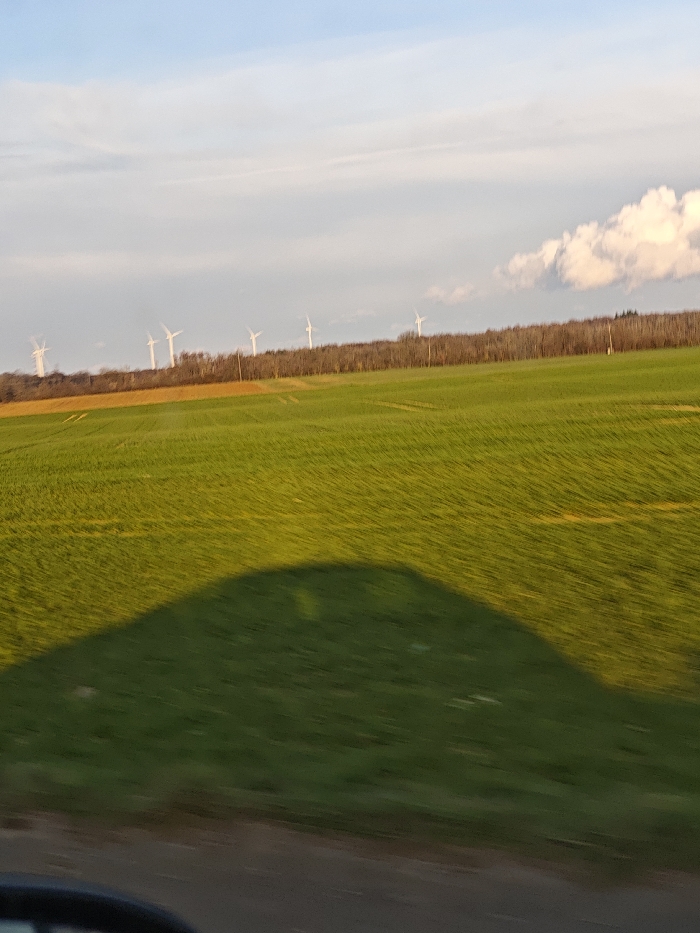 The image displays an expansive agricultural landscape in the vicinity of Aumetz, France, captured from a moving vehicle, indicated by motion blur across the foreground and midground. In the immediate foreground, a dark, partially visible object resembling a vehicle's side mirror is present at the bottom left edge, with a large, dark shadow, consistent with a vehicle, extending diagonally across the lower-left portion of a vibrant green field. This field, likely planted with young crops, occupies the majority of the midground, showing faint linear patterns from cultivation. To the left, behind the green field, a section of a contrasting yellowish-brown field is visible. A dense, horizontal band of leafless deciduous trees forms the background, separating the fields from the sky. Above this tree line, approximately eight white wind turbines with visible blades are dispersed, suggesting a wind farm. The sky is a light blue with scattered white and grey clouds, including a more prominent, brighter white cloud formation on the right. The lighting, characterized by a golden hue on the field and the long shadow, suggests late afternoon or early morning. No individuals or specific interactions are visible within the frame.