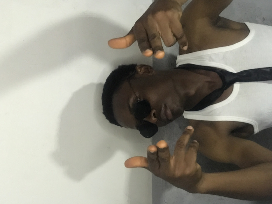 The image depicts a male individual, appearing of African descent, positioned against a plain, light-colored wall. This scene is situated within the city of Kirana, Nigeria. The subject wears dark sunglasses with dark frames, a white ribbed tank top, and a dark necktie draped loosely around his neck. He is positioned facing slightly to the viewer's right. His left hand (viewer's right) is raised, with the index finger extended forward and the thumb projecting upwards. His right hand (viewer's left) is similarly raised, with the thumb projecting upwards and both the index and pinky fingers extended. Two distinct, elongated shadows are cast on the wall behind and above the individual's head, indicating a light source positioned in front of the subject.
