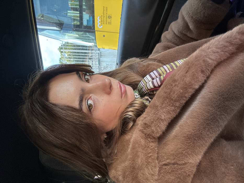 A young adult female is depicted in a close-up shot from inside a vehicle. She has brown hair with bangs, brown eyes, and is wearing a light brown faux fur coat over a multicolored striped scarf featuring shades of green, white, pink, and brown. Her head is angled slightly to her left, and she is looking directly at the camera with a neutral expression and lightly pursed lips. The interior of the vehicle is dark. Through the window to the subject's right, a yellow public transport bus is visible. The bus features "carris metropolitana" and "HORÁRIOS DE LISBOA" branding, along with a stylized 'M' logo, identifying it as part of the Lisbon metropolitan area's transport system. Behind the bus, a light-colored wall or fence and green foliage are visible under a cloudy sky. This scene is situated in Loures, Portugal.