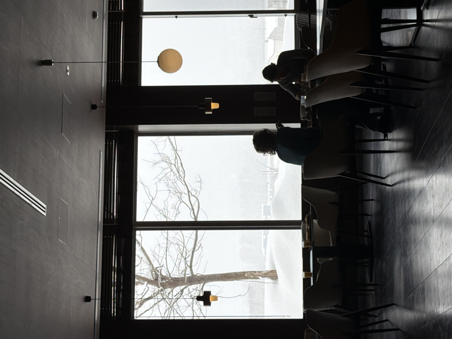 Inside a building with large windows, two individuals are seated at a table. Outside, there's a snowy landscape featuring a bare tree. The room's interior is dimly lit, highlighting the chairs and the wall with air vents. The lighting fixture consists of a spherical lamp and a small, square lamp near the window.