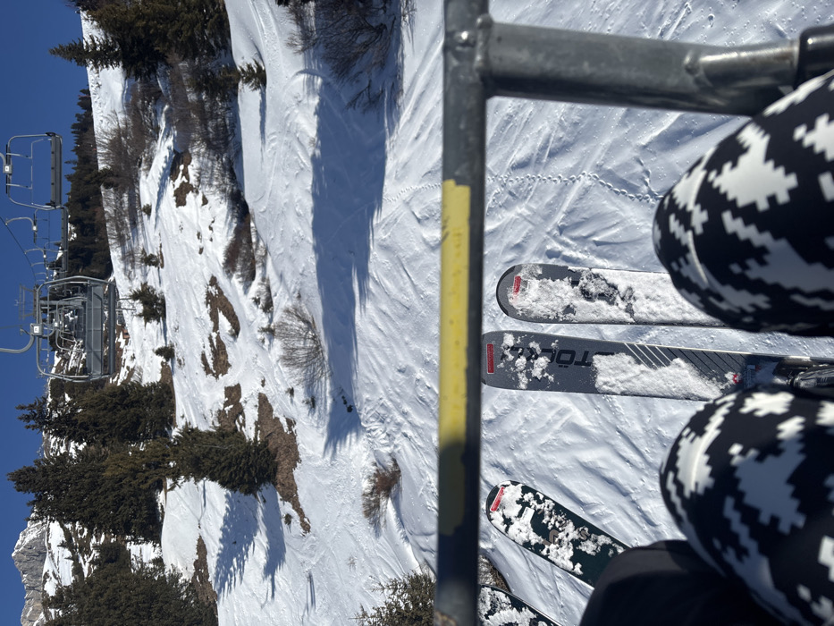 The image presents a first-person perspective from a ski lift ascending a snow-covered mountain in Sankt Anton am Arlberg, Austria. In the immediate foreground, the photographer's lower body is visible, clad in black and white patterned ski pants. A pair of skis, partially covered in snow, hangs suspended from ski boots, with the letters "TÖL" discernible on one ski. To the left, two additional pairs of skis are visible. A yellow and gray metal safety bar from the ski lift extends across the upper portion of the foreground. The slope below is heavily snow-covered, exhibiting visible ski tracks and untouched powder. This terrain is interspersed with numerous evergreen trees of varying sizes and bare deciduous shrubs. Patches of exposed brown earth are visible where the snow is shallower. Long shadows are cast across the snow by trees and topographical features, indicating direct sunlight under a clear blue sky. Further up the slope in the mid-ground, multiple empty grey ski lift chairs are observed ascending. The distant background reveals prominent snow-dusted rocky mountain peaks under a cloudless sky.