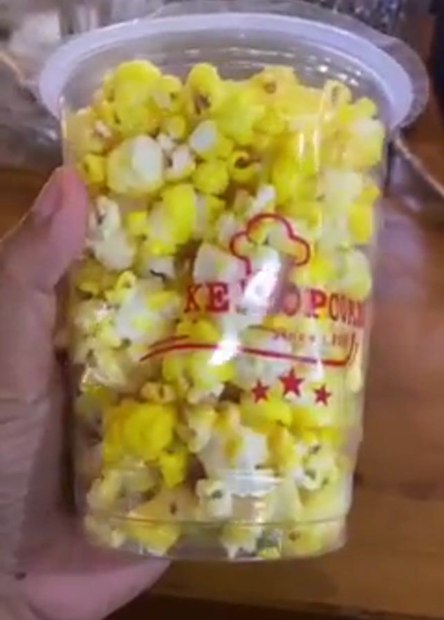 A hand holds up a clear plastic cup filled with popcorn, some of which is colored yellow
