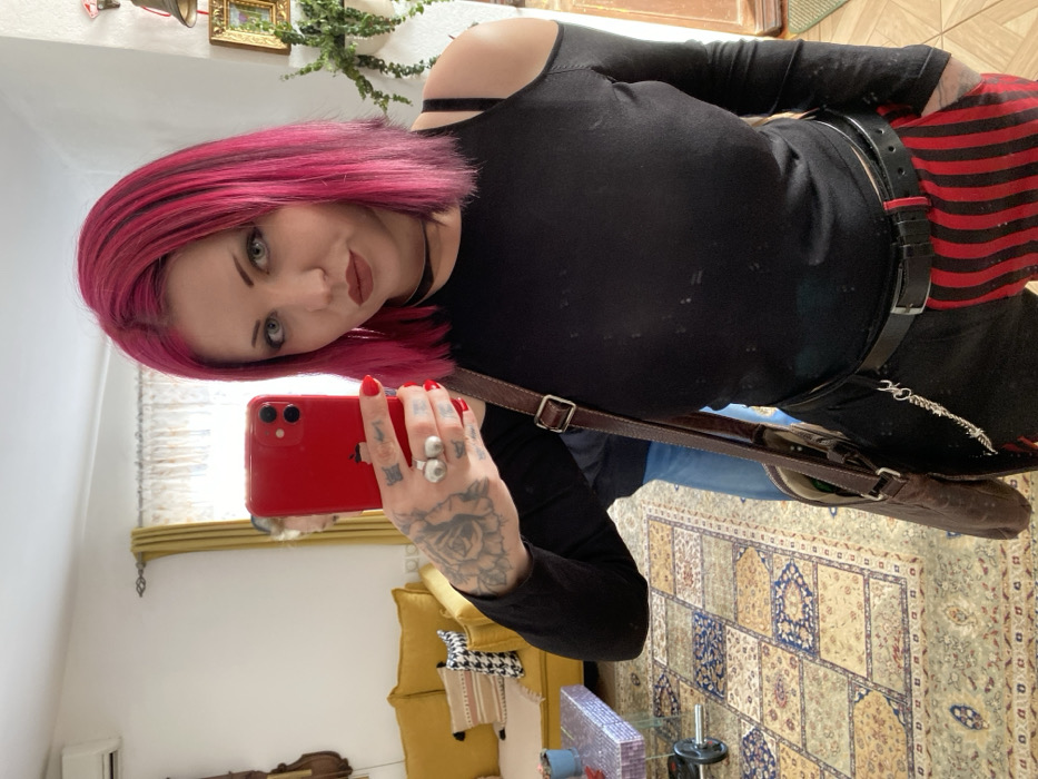 The image depicts a woman taking a mirror selfie in a residential interior in Kunje, Montenegro. The woman has bright pink, shoulder-length hair, light eyes, and dark lipstick. She is wearing a black long-sleeved top with cold-shoulder cutouts, a black choker, and black trousers with red vertical stripes on the right leg, a black belt, and a silver chain accessory on the left hip. A brown leather shoulder bag with a visible buckle strap hangs across her body. She holds a red smartphone with her right hand, which has red-painted fingernails and a silver ring with two spherical elements on the ring finger. Tattoos of roses are visible on the back of her left hand and wrist. A partial reflection of another individual with blonde hair is discernible behind the smartphone. The room features light-colored walls, a mustard-yellow sofa with patterned cushions to the left, and a low, rectangular coffee table with a textured, possibly mosaic-like, purple surface in front of it. A patterned rug with a grid of blue, green, brown, and beige squares covers the floor. Objects present include a dumbbell and a blue pot on the floor near the coffee table, an air conditioning unit on the upper left wall, yellow curtains, a hanging stringed instrument (possibly a violin) on the left wall, and a brass bell, a framed picture, and a hanging green plant on the right wall.