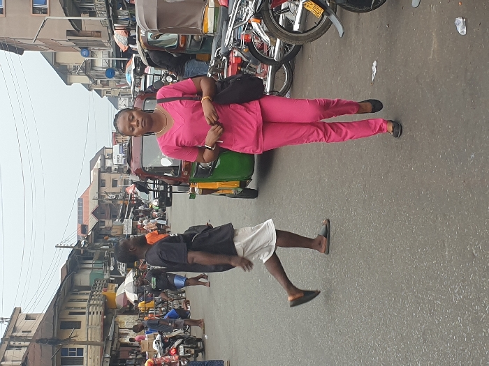A street scene depicts a woman in pink scrubs walking alongside a man in a black shirt and white shorts. The backdrop shows a bustling market street, complete with motorcycles, tuk-tuks, and various vendors. Buildings of varying heights line the street, creating a sense of urban density. The overall impression is that of a lively, busy environment with people going about their daily activities.