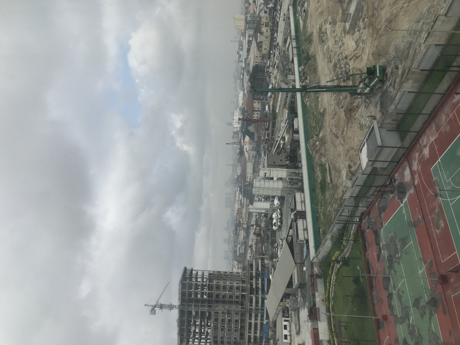 This high-angle image depicts an expansive urban and industrial landscape in Ilado, Nigeria, under an overcast sky with patches of grey clouds and a small area of blue sky. In the foreground, occupying the lower left, are two outdoor sports courts with red and green surfaces, marked with lines resembling those for basketball or tennis, showing visible wet patches. Adjacent to these courts is a manicured green area featuring curved pathways. A light-colored boundary wall separates these leisure areas from the main midground. A small, rectangular, light-colored utility building with a dark roof stands next to this wall. The midground is dominated by significant construction and industrial activity. To the left, a multi-story building is under construction, presenting a concrete structural frame with multiple floors, topped by a tower crane. Adjacent to this, an industrial compound features several tall, conical white silos, numerous concrete mixer trucks, and various industrial buildings, indicative of a concrete batching plant. To the right of this compound, a large, excavated dirt plot shows piles of earth and a prominent green piling rig. Numerous other smaller buildings, roads, and parked vehicles are scattered throughout this section. The background extends into a sprawling urban environment, densely packed with various residential and commercial buildings of different heights and architectural styles, stretching to a hazy horizon. No individuals are discernible in the scene.