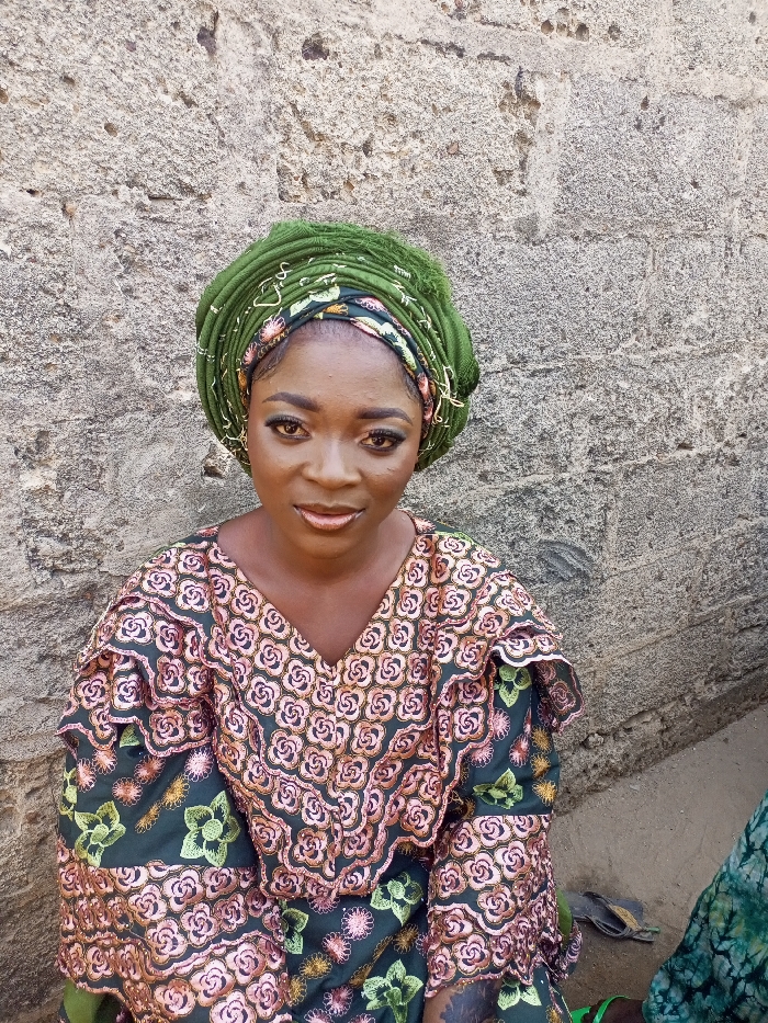 A portrait of an adult female is presented against a textured wall in an outdoor setting in the city of Unknown, Unknown. The subject, with dark skin, is positioned centrally, looking directly at the camera. She has prominent eye makeup, including eyeliner, eyeshadow, and false lashes, with well-defined eyebrows. Her head is covered by an elaborate, layered olive green headwrap, beneath which a patterned fabric featuring green and light floral designs is visible. She wears a dark green garment, likely a blouse or dress, adorned with intricate pinkish-brown floral patterns (resembling roses) and lighter green floral embroidery. The garment features a V-neckline and ruffled details across the upper chest. The background consists of a rough, unpainted concrete or cinder block wall exhibiting varied texture and signs of weathering. At the bottom right, a partial view of a second individual's leg, clad in green and white patterned fabric, is visible, alongside a single dark-colored flip-flop or sandal resting on reddish-brown soil or sand.