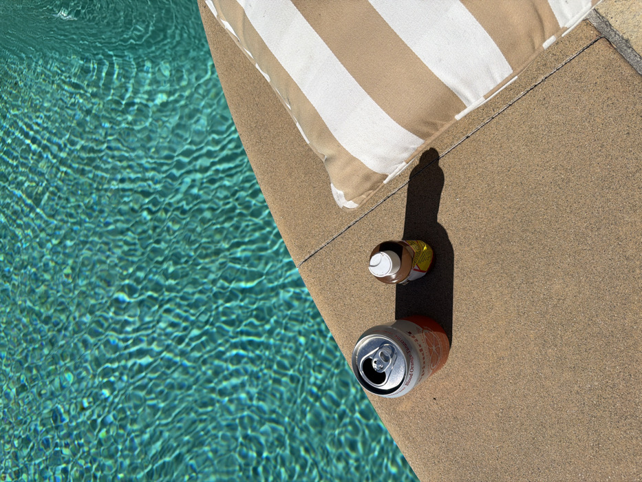 The image displays an outdoor swimming pool environment in Los Angeles, United States of America, consistent with a private residence or resort. The upper left quadrant of the frame is dominated by rippling, turquoise-hued pool water, actively reflecting sunlight. A granular, light brown concrete pool deck with a visible expansion joint diagonally separates the pool from a leisure area. Situated on this deck, near the pool's edge, is an open, silver-colored aluminum beverage can with a label identifying "Blood Orange Tangerine." Immediately to its right, a small, amber-colored bottle with a white screw-top cap stands upright, casting a distinct shadow on the deck. A beige and white striped outdoor cushion is partially visible on the far right of the frame, resting on the deck. No individuals are present. The scene is brightly illuminated by direct sunlight.