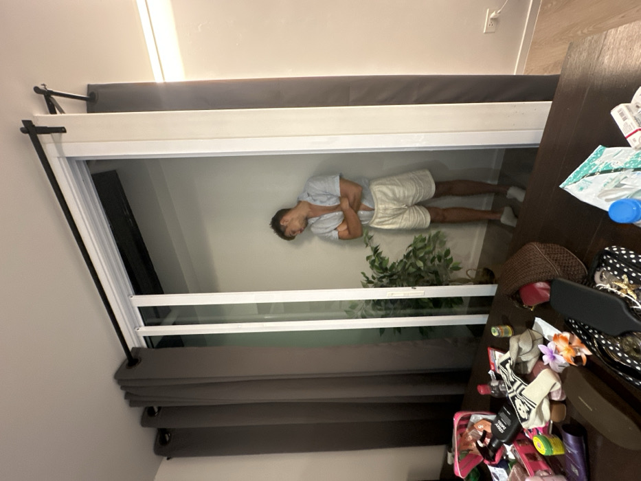 The image displays an interior room of a residence in Baan Chaweng, Thailand. In the foreground, a dark wooden table is laden with various personal effects, including an open pink cosmetic bag with contents, a black lotion pump bottle, sandals, a brown sunglasses case, a black hairbrush, a small dark woven handbag, a polka-dotted pouch containing gold-colored jewelry, a blue plastic bottle, a white and green patterned bag, and a red and white Marlboro cigarette pack. In the midground, a large sliding glass door system with white frames functions as a partition. Dark gray grommet-style curtains are partially drawn on black rods to either side of the door. Behind the glass door, a light-skinned male subject, appearing to be in his late 20s to early 30s, stands with his back partially against a white wall. He is dressed in a light-colored, short-sleeved button-up shirt, mostly unbuttoned, and light-colored shorts, with light-colored socks or slippers. His arms are crossed over his chest, and his head is tilted downward and to his right. To the male's left, an artificial plant in a woven pot is visible. The background consists of white walls, a white ceiling, and light-toned flooring, illuminated by overhead artificial light.