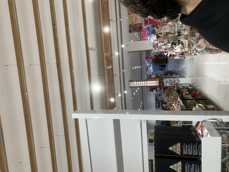 Inside a brightly lit store, aisles stretch into the distance, filled with merchandise on shelves. Christmas decorations and gift items are plentiful. The high ceiling features wooden beams and lighting fixtures. The foreground includes store fixtures displaying products. A person is partially visible in the upper right corner, suggesting a customer's perspective. The overall impression is a busy retail environment.