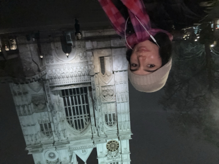 A person wearing a beige beanie, headphones, and a checkered scarf poses in front of a large, illuminated stone building at night. The building's facade exhibits intricate architectural details, including arched windows and decorative carvings. Bare tree branches are visible in the background, suggesting a park or outdoor setting. The image is rotated sideways.