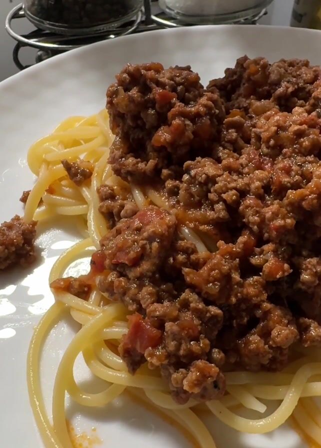 A close-up shot reveals a white plate of spaghetti topped with a generous portion of meat sauce
