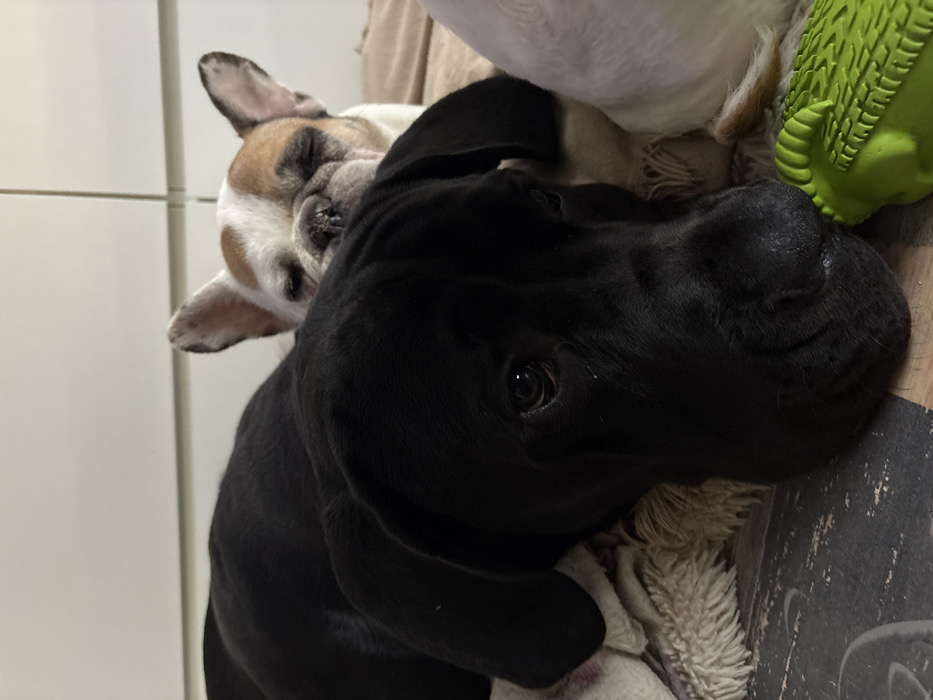 This image captures an indoor scene in Perushtitsa, Bulgaria, featuring two dogs resting. In the foreground, a large, black-furred dog, breed undetermined, lies prone with its head positioned centrally. Its left eye is visible and partially reflective, while its snout rests near a bright green, textured rubber dog toy, molded in the shape of an alligator head, located in the lower right. Partially visible behind and to the right of the black dog is a smaller, fawn and white French Bulldog. Its face is characterized by a wrinkled snout and closed or squinted eyes, with both ears erect. Both dogs are situated on soft, layered bedding, including a visible light-colored, shaggy blanket. The background consists of a plain, light-colored vertical surface, likely a wall or furniture panel, with a faint vertical seam. No human subjects are present.